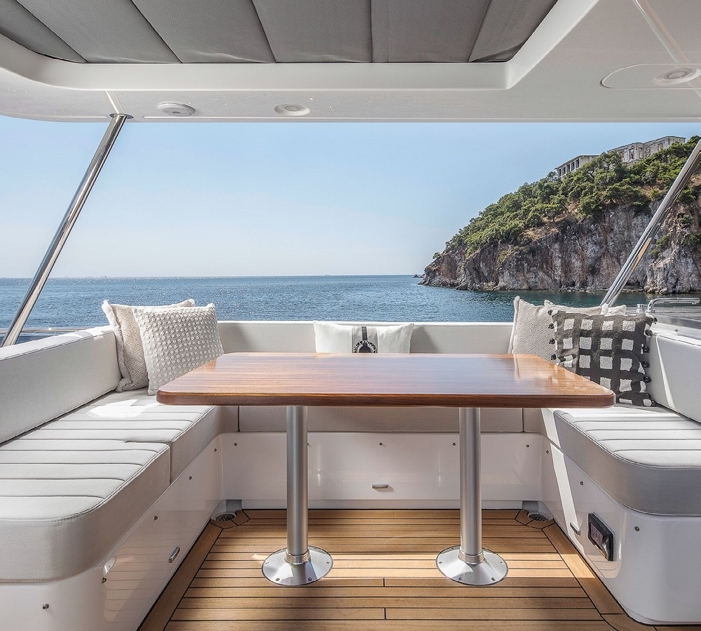Sirena 60 доступна в двух версиях: с флайбриджем с хардтопом и без него. Первый корпус, продемонстрированный в Каннах, — с флайбриджем с хардтопом. Если в солнечный день не открывать сдвигающуюся секцию крыши, тень обеспечена и над постом управления, и над баром, и над обеденным столом. Представители верфи рассказали нам, что пока не получали заказов на открытую версию Sirena 60. А также добавили, что большинство гостей стенда верфи в Каннах после выхода на Sirena 60 отметили, насколько уверенно они себя чувствовали на борту даже в неспокойном море и насколько на яхте было тихо. Добавим, что отличительная (и подкупающая) особенность яхт Sirena — в ее полуводоизмещающих корпусах, одновременно мореходных и экономичных.