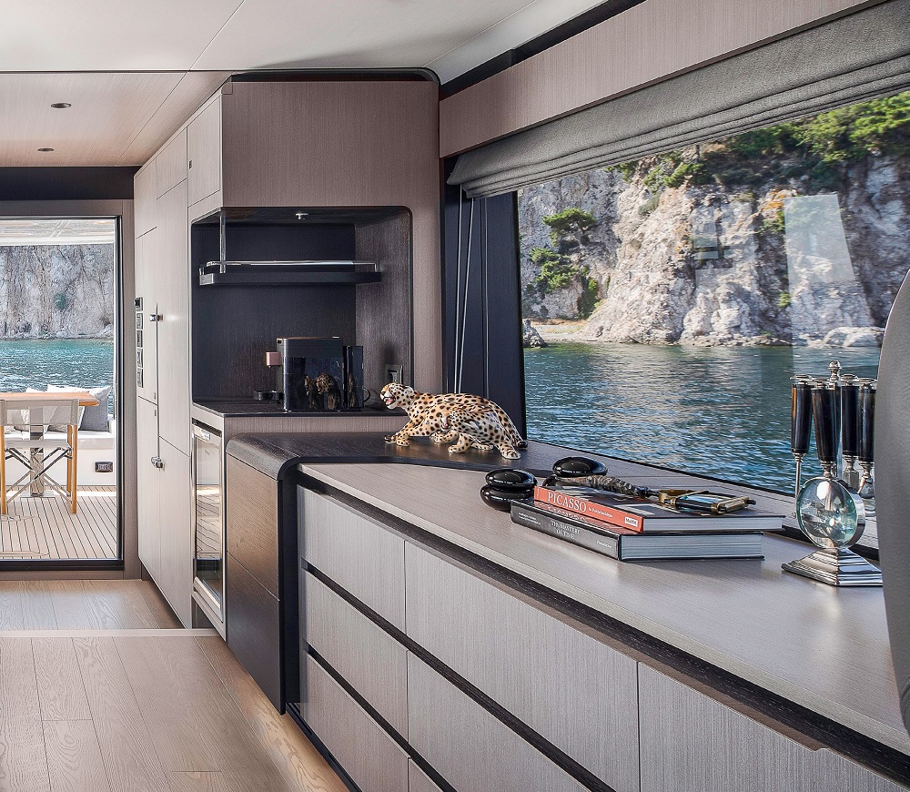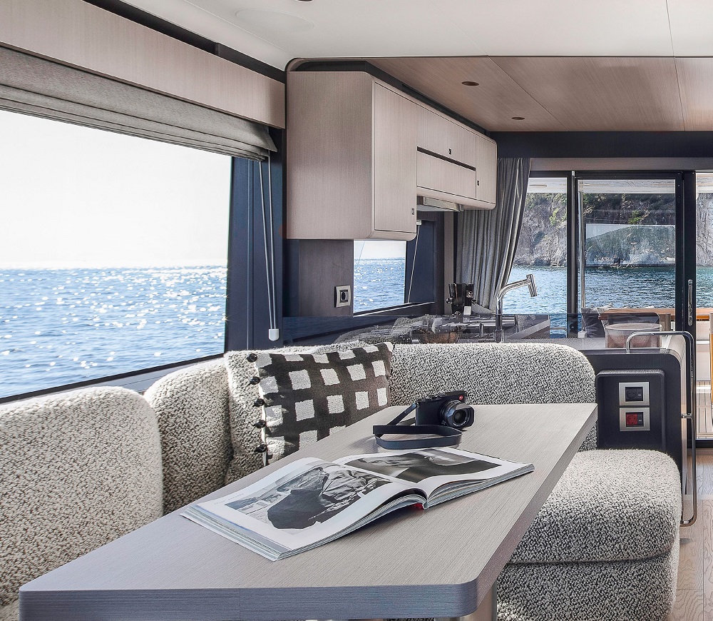 Хоть уютный лаунж на фордеке покидать совсем не хочется, мы перемещаемся в салон, еще снаружи заинтриговавший нас тонированными панорамными окнами. Они действительно у Sirena 60 гораздо больше, чем у 58‑й модели. Благодаря величине окон салон кажется просторней, хотя, если верить цифрам, фактически увеличилась тут лишь площадь кухни, с салоном объединенной. Теперь она составляет 5 кв. м, и уместилось тут все необходимое для ежедневного приготовления еды. На верфи рассудили, проанализировав отзывы своих клиентов, что такие яхты, как Sirena 60, приобретают для времяпрепровождения с семьей и близкими и часто предпочитают готовить на борту самостоятельно. Поэтому и было принято решение усовершенствовать именно кухню.