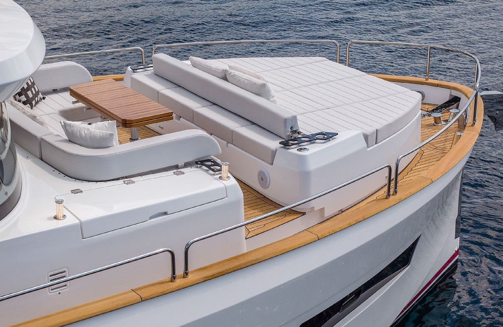 Собственно, и габаритная длина новой яхты больше 60 футов (фактически она составляет почти 64 фута). Зона для обедов al fresco на главной палубе, с которой и начинается знакомство с новой яхтой, без каких‑либо стеснений вместит компанию из восьми человек. Рано или поздно кому‑то захочется переместиться на нос: отсюда и вид лучше, и расположиться здесь можно с бокалом дижестива гораздо вольготнее. Собственно, в зоне фордека нас ждал самый большой сюрприз. На верфи ее полностью переделали, и у Sirena 60 она стала универсальной. Стол на телескопических ножках, полукруглый диван и лежак с подвижной спинкой-подголовником можно использовать для приема пищи, сервировки коктейлей, в качестве «солярия» или места для послеобеденного отдыха. Удивительно, что все это стало возможным исключительно благодаря такой находке, как «плавающая спинка», которая превращает лежак для загорания в диван. На наш взгляд — гениальное изобретение производителей мебели для яхт.